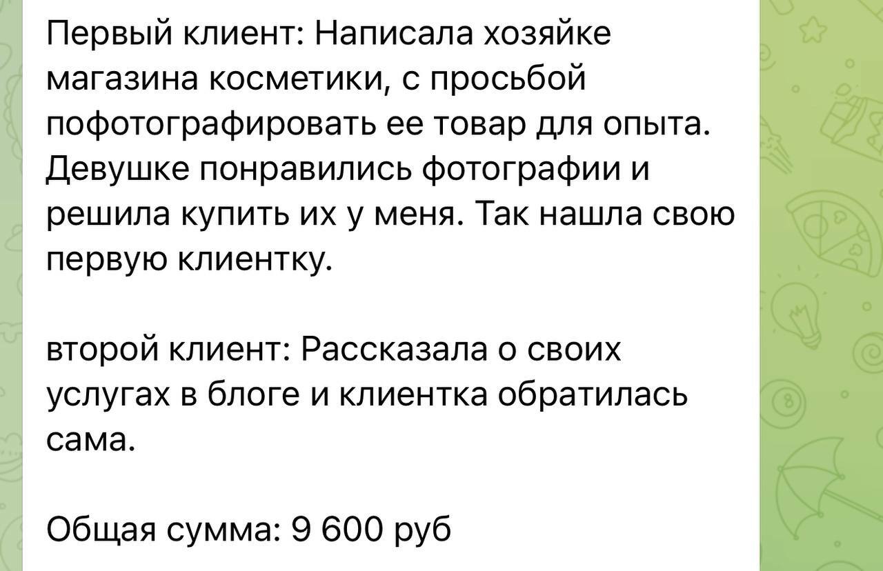 — оформила свой профиль в instagram и начала активно писать потенциальным клиентам, многие согласились сотрудничать