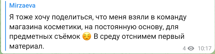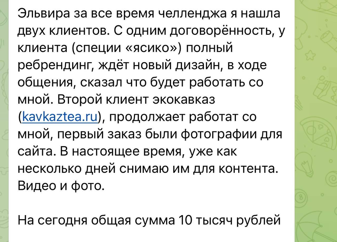 — Провела съемки для брендов сумок, одежды и магазина колбасных изделий. А также поняла, как привлекать клиентов, в следствии чего договорилась на работу с бизнес-наставником для развития его личного бренда;