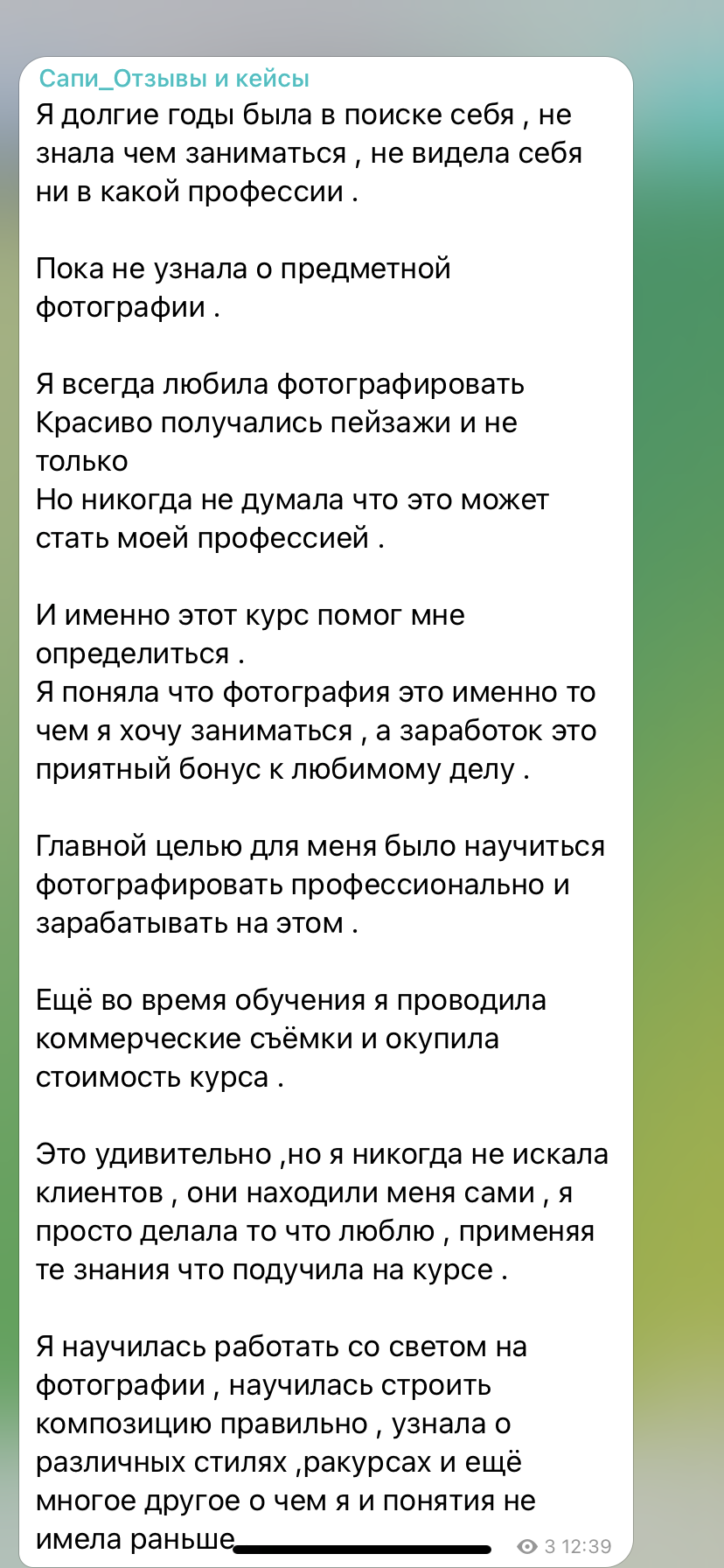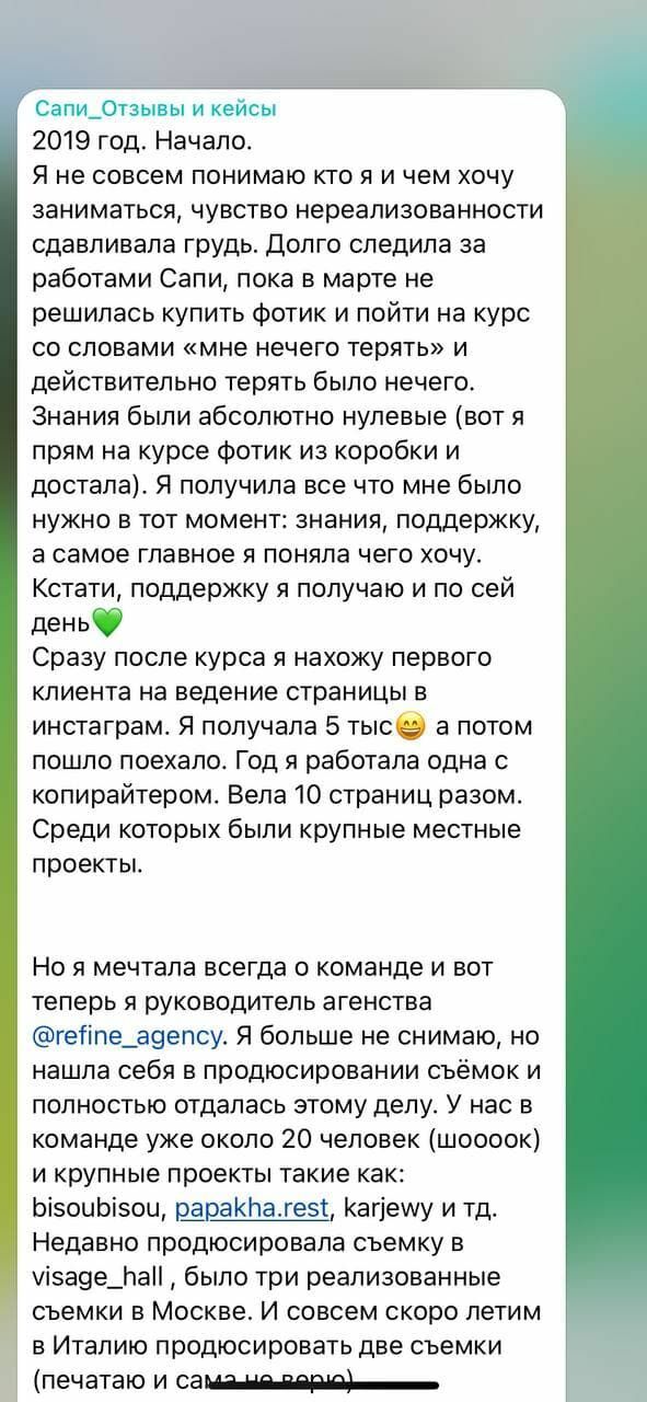 – на курсе у Сапи окончательно определилась, чем хочет заниматься и уже в процессе обучения окупила стоимость курса, проводя коммерческие съемки.